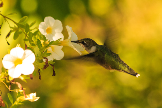 hummingbird gets nectar from the last of the flowers as the summer season comes to an end