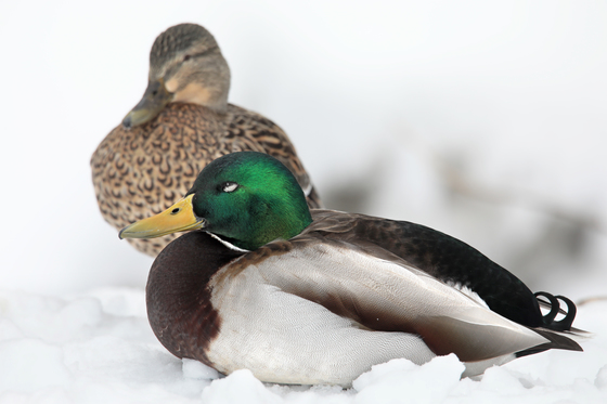 A couple of Mallard ducks on snow