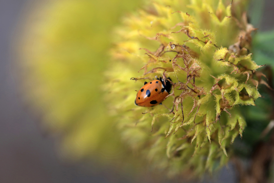 A Lady bug on a flower. Photo taken at a Botanical garden