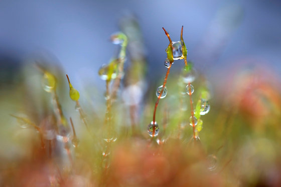 A macro photography of water drops on green moss. Photo taken in the wood