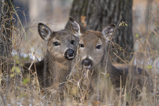 I stumbled upon these two whitetails fawns sleeping together in the woods. Here's the moment they realised I was nearby. After I took a few pictures, I carried on along my path and let them get back to sleep.