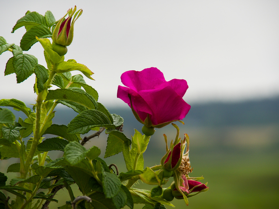 This is wild rose on the dunes of Mavillette Beach, Nova Scotia