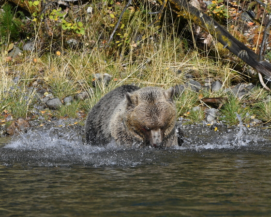 The female Grizzly has the Sockeye Salmon in her claws. She did not put her head underwater, but brought the salmon up with her claws.