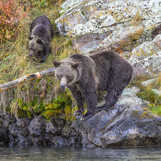 Mom Grizzly and her Cub looking for a great perch to spot spawning Sockeye Salmon.