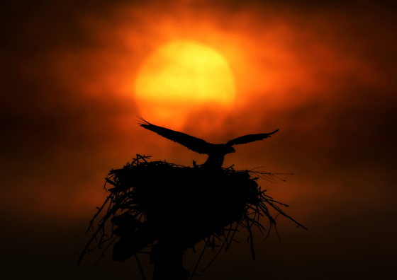 This osprey is in the take off position and ready to fly out of the nest for one of the first times. The sun is at nest height and all systems go.
