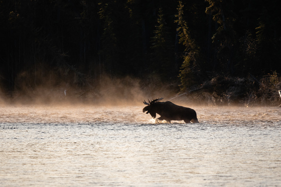 Bull moose wades through a misty river following a female during the rut