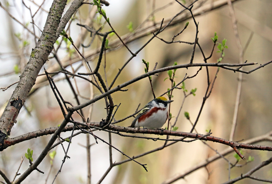 This Chestnut Sided Warbler, Setophaga pensylvanica, has very distinctive coloring with a yellow crown, white breast, chestnut or reddish streaks and a black mustache. It's song sounds like, "please please pleased to meetcha." An insectivorous bird whose habitat is second growth and scrubby woods.
