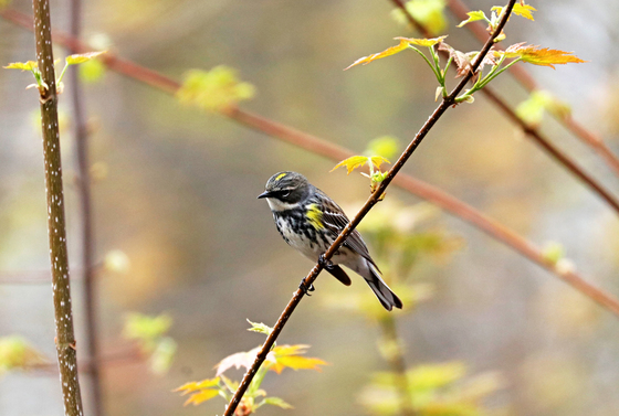 I had gotten a bird report that there were about five different types of Warblers at the arboretum in Guelph Ontario Canada and so I went the following day to try to find them. I found four different Warblers and this handsome male Yellow Rumped Warbler was one. The males are quite dazzling in bright yellow, charcoal gray and black and bold white especially in the spring.