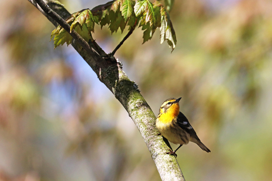 I was very excited to see my first Blackburnian Warblers. This very lovely female Warbler was perched on a Maple tree branch in spring. It has a dull black crown, black triangular facial pattern, brilliant orange yellow throat and a vivid orange yellow face and it was quite beautiful.