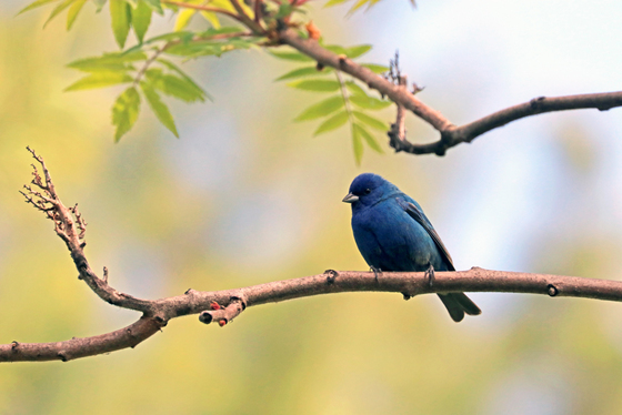 It was a cold, windy spring day but I wanted to go out looking for birds. I was at the end of my walk when I decided to check the garden area again and what did I find but the beautiful male Indigo Bunting perched on the branch and looking extremely handsome! The all blue male Indigo Bunting with the head being indigo and the body being cerulean blue with black and brown looks like a scrap of sky with wings.