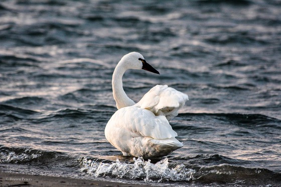 A tundra swan stopped and had decided to have a quick clean on a cold and wavy day.