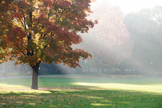 Shafts of sunlight stream through the fog on a glorious fall morning in Major's Hill Park