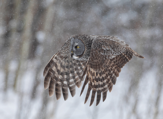 It took me three days to adjust shooting to capture a Great Gray Owl in flight without clipping its wings because it is so large. On this day, the GGO was hunting early in the overcast and snowy weather. A high shutter speed and large aperture were used to capture the flight shot as light was minimal in the snowy weather.