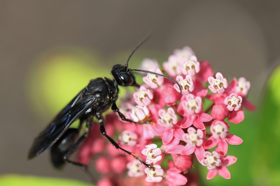 A long black flying insect on search for pollen. Photo taken at a Botanical garden,