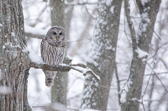 I wasnt going to go out in the snowy weather yesterday but I am glad I did, this Barred Owl was resting in a tree watching the falling snow around him.