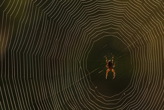 A spider and its web catch the morning sun before catching flies for breakfast.