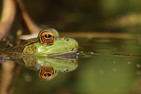 A Bullfrog pokes up above the water at the edge of a lake in Victoria.
