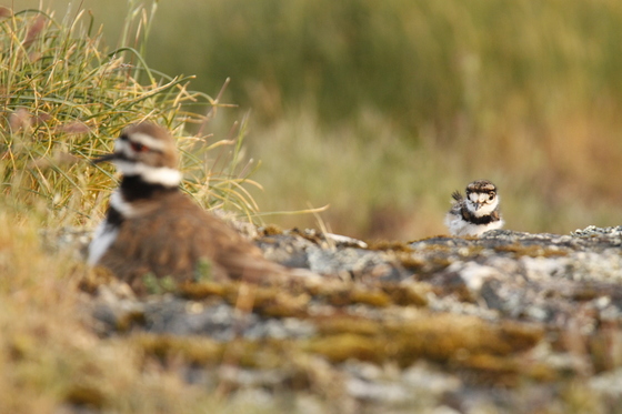A newborn Killdeer goes exploring while keeping its parent still within sight.