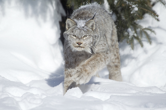 Poor snow kitty was laying under a big pine tree when the wind blew all the snow off of its branches and onto her back Canada lynx, Northern Ontario, Canada