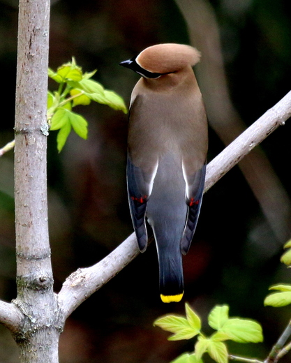 A Cedar Waxwing sits on a branch below where I standing unaware I'm watching him.