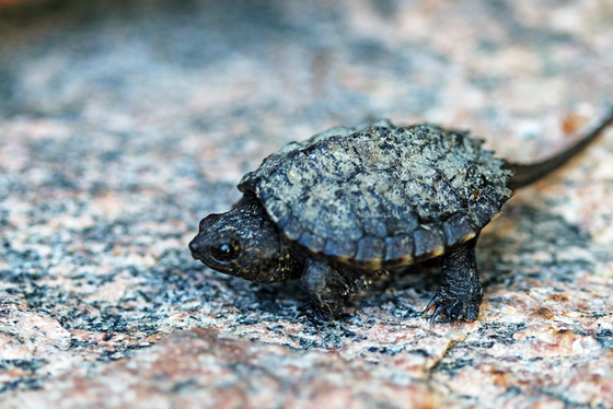 I have seen quite a few large Snapping Turtles but never a baby. They are so darn cute. This little one was walking on a rock in Guelph Ontario Canada. The Snapping Turtles are the largest freshwater Turtle in Canada and they take upwards of 15 - 20 years to mature with the female breeding around 17 - 19 years old. They only come out of the water occasionally to bask and since their plastron is so small they cannot withdraw into their shell for protection so they snap to scare away predators.