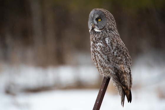 A great grey owl hunts for voles in a rural area near Ottawa