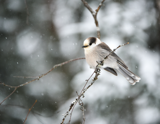 A Canada jay comes to great us in a parking lot in Algonquin park
