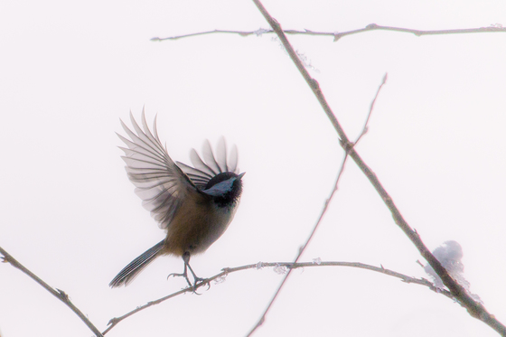 Black capped chickadee taking flight, late fall/early winter 2019