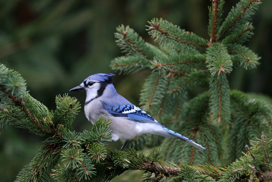 This beautiful, striking, azure Blue Jay, Cyanocitta cristata, was finally quietly perched in a Spruce tree in our yard in Guelph Ontario Canada. This urban dweller is unmistakable both for its vivid blue color and its very loud cries which it uses as a warning. This large attractive songbird loves peanuts and will be quite aggressive when another gets too close to its food source.