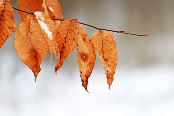 The brown papery snow kissed leaves of the Beech Tree hang on to the branches in late fall in Guelph Ontario Canada.
