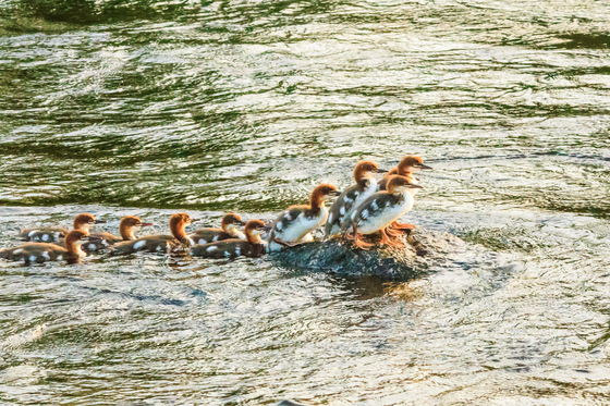 young mergansers watched their mother get up on the rock and off the other side, and decided to try it themselves