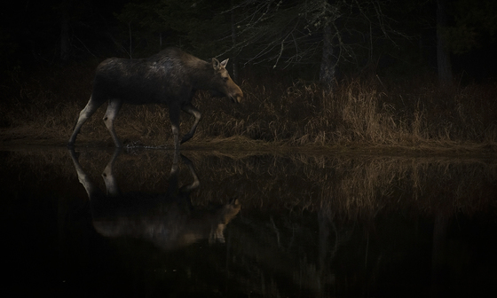 A Moose walks out of forest shadows and along the edge of a beaver pond in Algonquin Park, Ontario, reflecting in the dark water.