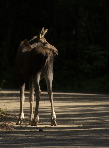 Driving slowly along a backroad in Algonquin Park, Ontario i rounded a corner and noticed a Moose calf trotting along the edge of the road in front of me. Moving in and out of the shadows and bright sunshine it was though parts of the moose would almost vanish into temporary darkness.