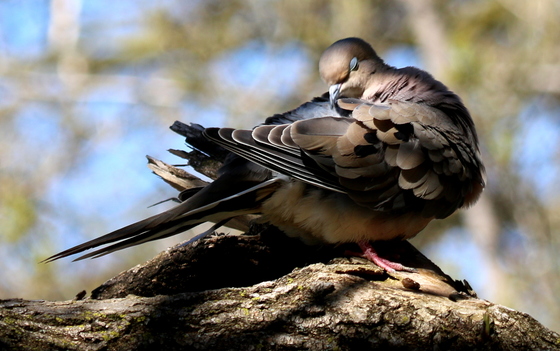 A Mourning Dove busy preening itself.