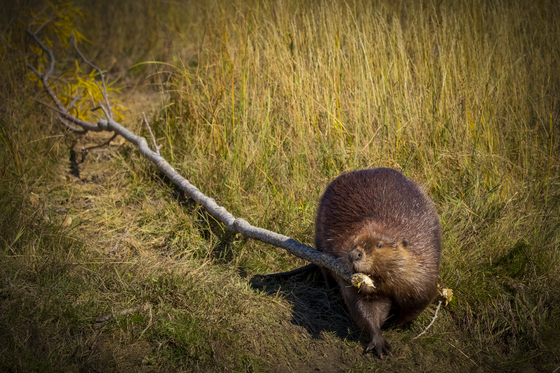 A local pond by the river outside Saskatoon is home for an industrious pair of beavers. During one of my regular visits to watch the pair I was treated to this shot of one dragging a tree down to the pond for lunch and/or construction of their lodge.