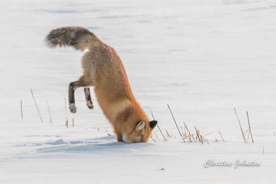 A red fox heard a mouse or vole under the snow and leapt high landing face first in the snow.