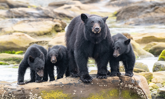 A mother and her 3 cubs stand together waiting for salmon to enter the river on Vancouver Island
