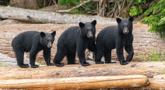 Three black bear cubs stand together and watch mom roam the low tide for food. The cubs were staying close together at the edge of the forest as another bear came out at the same time.