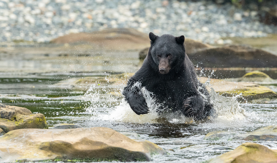 A large boar puts the chase on returning pinks salmon on a small river on Vancouver Island