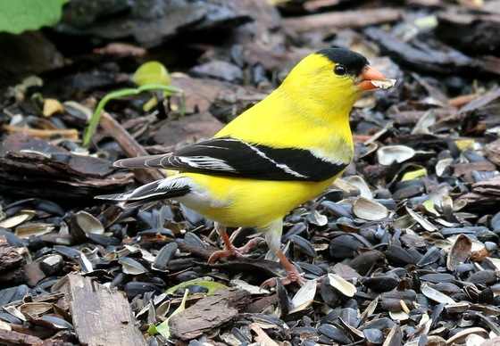 An American Goldfinch is busy eating sunflower seeds after migrating north in May.