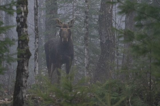 Walking a woodland trail in Algonqui Park just before dawn, I got the distinct feeling I wasn't alone (the sound of crunching undergrowth was also a bit of a give away). I stopped and waited for a few minutes to see who my hiking buddy was, when a young bull moose walked out of the mist to check me out.