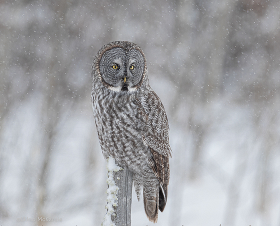 Trying to photography animals in snowy conditions is tricky with lighting conditions. Rather than use a very high ISO, I tried a slow shutter speed using a cable release and the camera mounted on a tripod. Fortunately the owl was still for a few moments to capture this image.