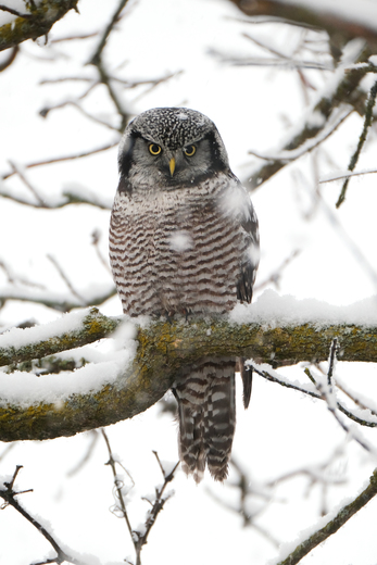 A Northern Hawk Owl looks for a meal while perched in a tree.