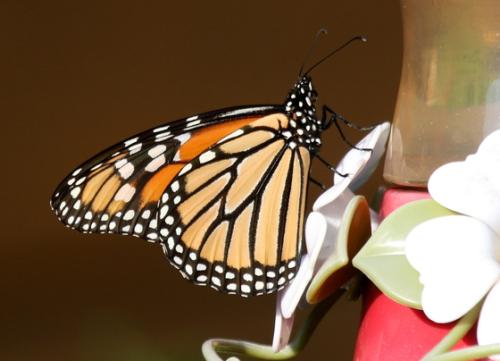 This Monarch Butterfly sitting on the hummingbird feeder looks like he wants a drink of the nectar. Hopefully he managed to get some.