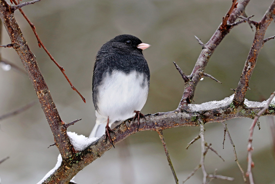 What a lovely portrait of this Dark Eyed Junco perched on a snowy, thorny tree in late fall in Guelph, Ontario Canada. The Juncos come to southern Ontario for the winter and I do look forward to having them around for a few months.