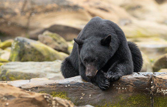 coastal Black bear sits patiently waiting for a salmon to swim by - Vancouver Island BC