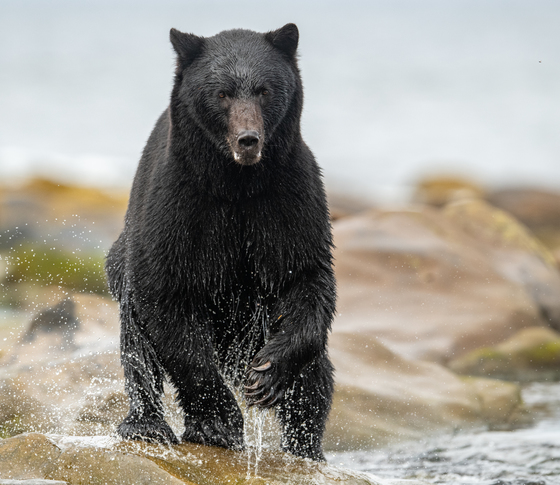 Big boar black bear running towards me in chase of salmon splashing int he shallows on Vancouver Island BC
