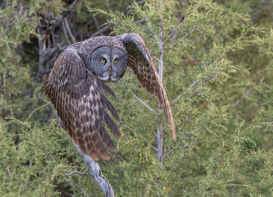 Male Great Grey Owl flies from perch to perch in search of prey - Interior of BC