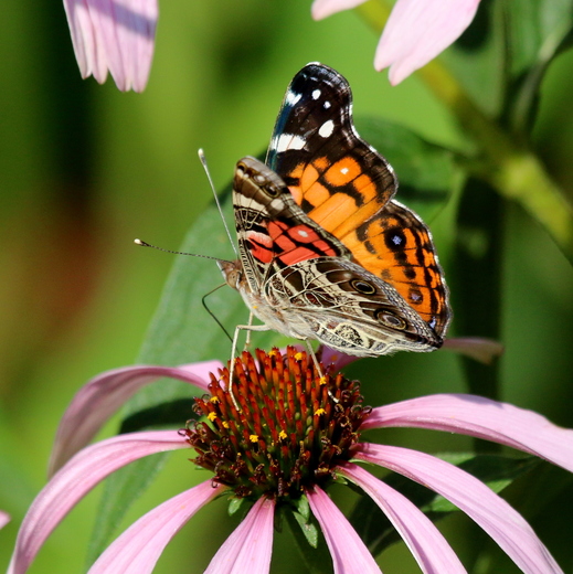 An American Lady Butterfly visiting my yard rests on a Coneflower.