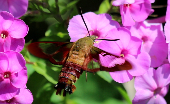 This Clearwing Moth has visited my Bee Balm flowers for the last couple of years. Often referred to as a Hummingbird Moth as it's a Moth seen during the day and it's movements are similar to a Hummingbirds at flowers.